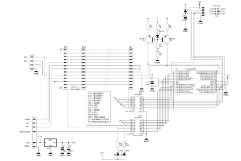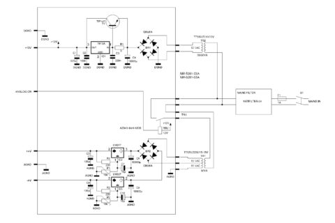 The power supply consists of a board and two toroidal transformers one for the digital electronics (12V) and a second one for powering the analog stages (plus and minus 13V). The power supply connects to the backplane with a 6 pole molex cable that next to the supply voltages also carries the control signal for the analog stage supply, the digital stage is always ON and the analog stage is controlled by the microcontroller.